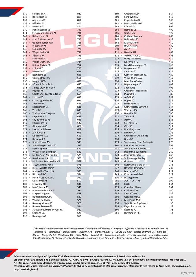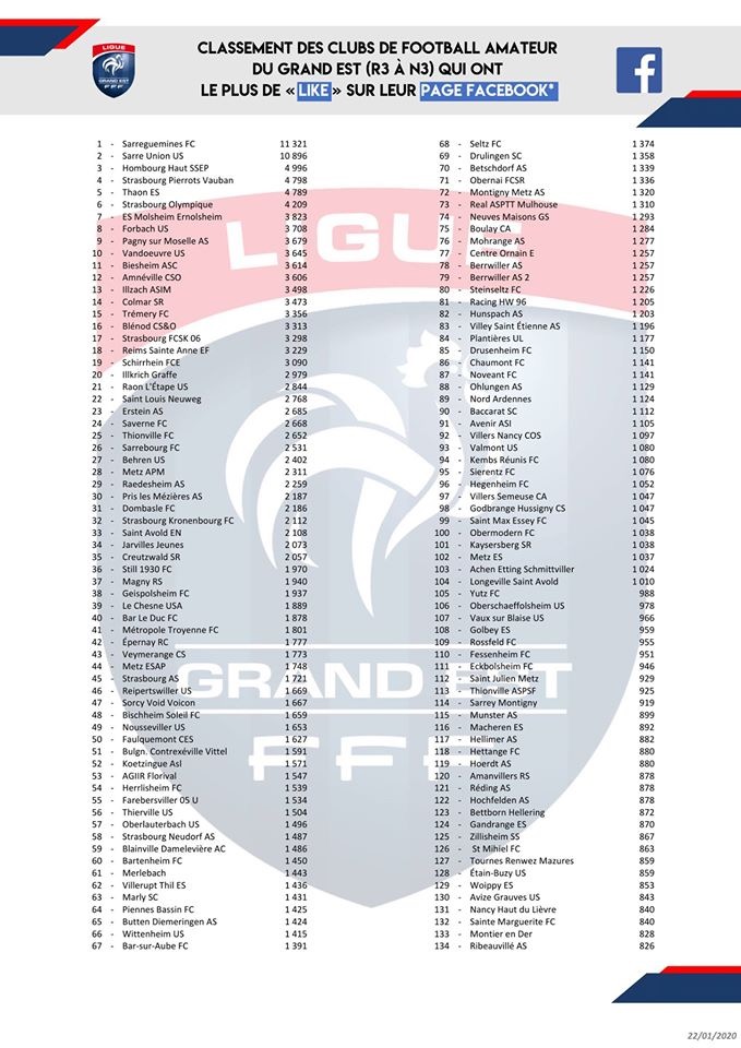 Voici un recensement de toutes les pages Facebook des clubs de football amateur de la Ligue Grand Est (N3 - R1 - R2 - R3).