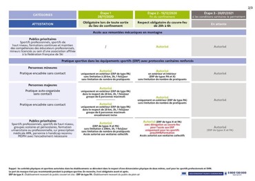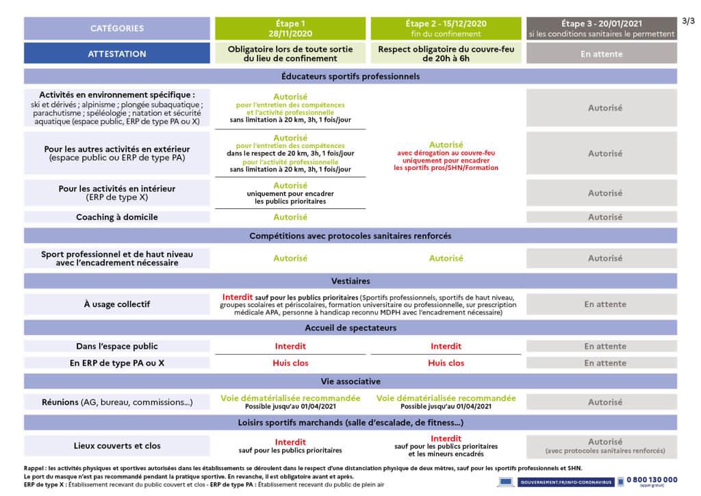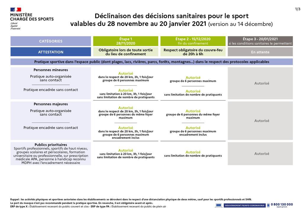 En photo les décisions au 14/12/2020 applicables au 15 décembre 2020, pour les mineurs, majeurs, spectateurs, vestiaires ....