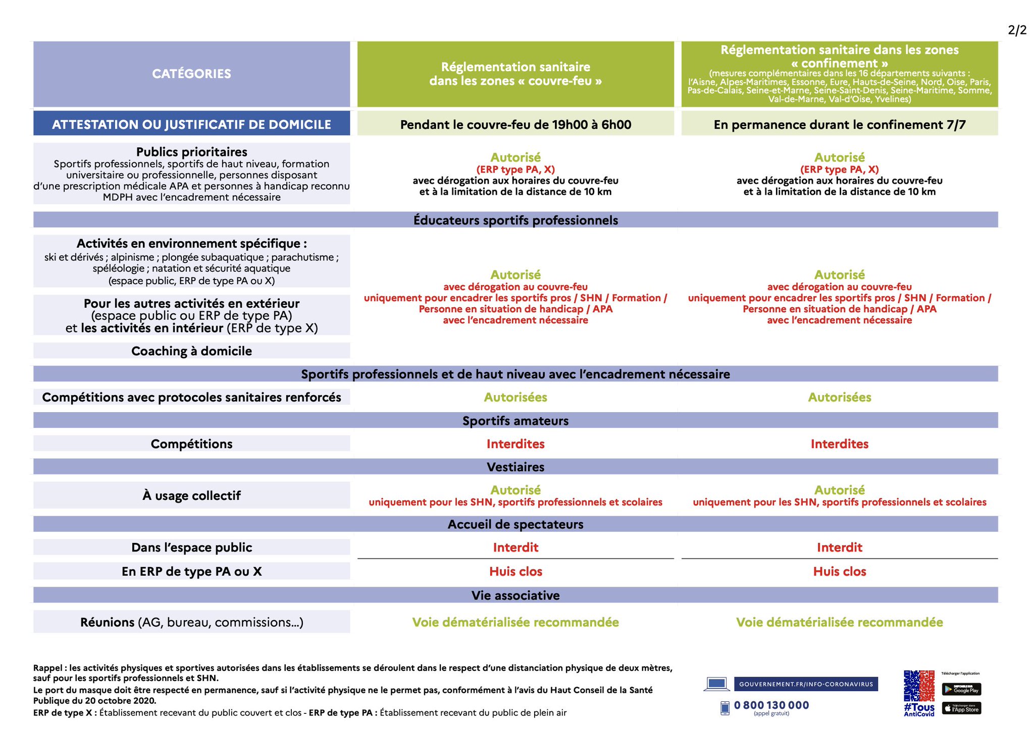 Voici en tableaux édités par le ministère des sports les mesures sanitaires