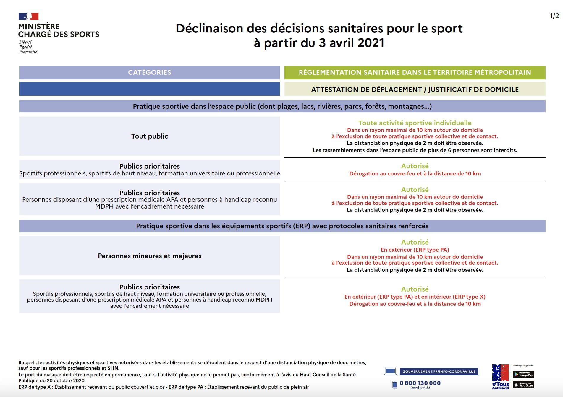 Le décret relayé par le ministère des sports vient d’être mis en tableau pour mise en place dès ce jour samedi 3 avril 2021 :