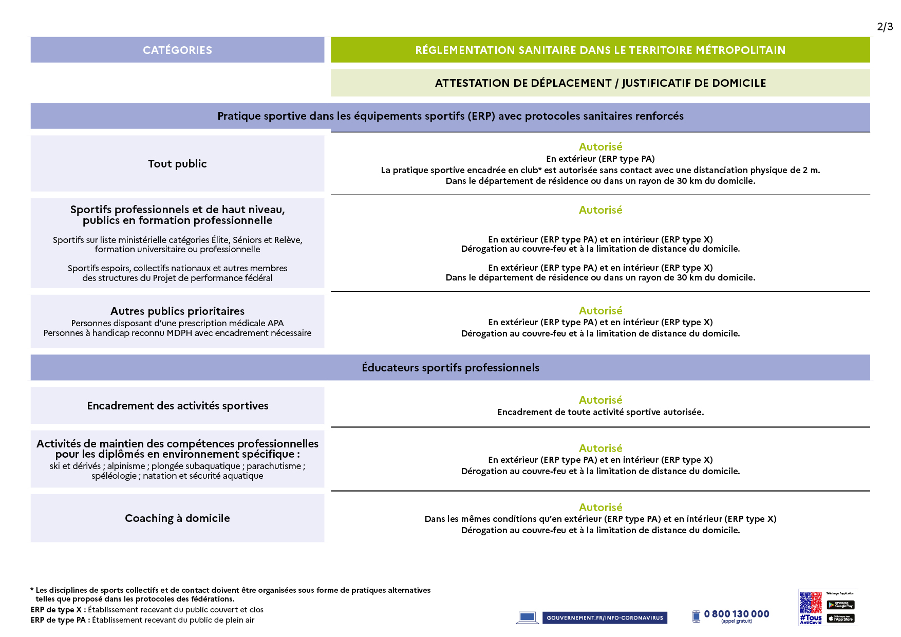 - Possibilité de se déplacer dans son département de résidence (ou déplacement limité dans un rayon de 30 km du domicile si changement de département) pour aller sur le lieu de pratique avec