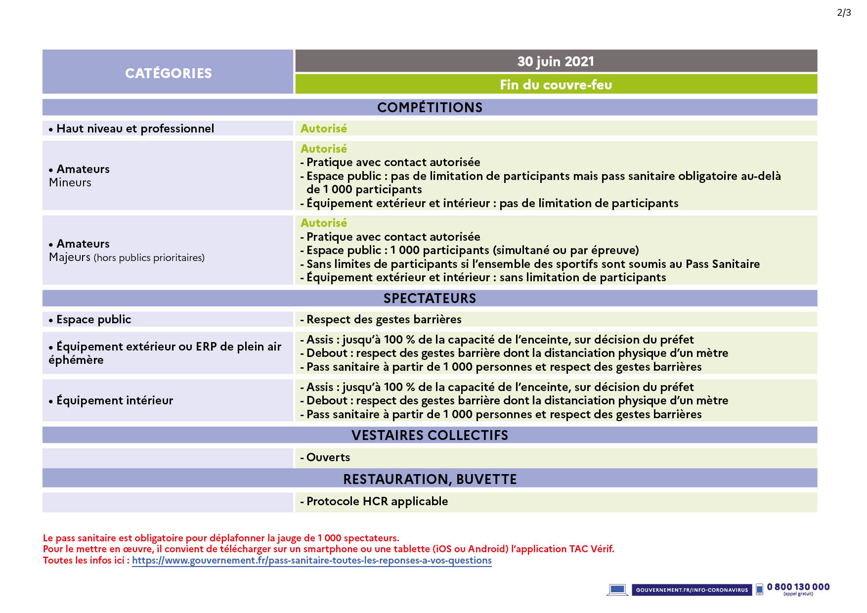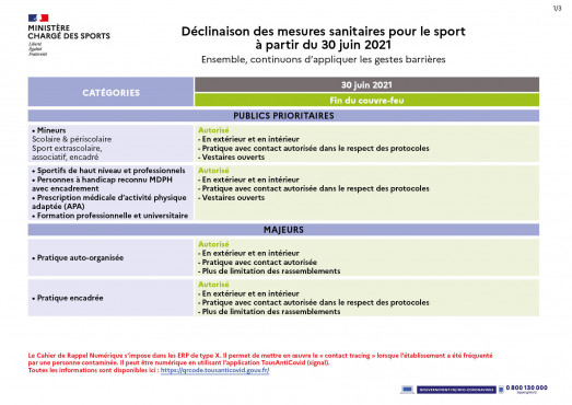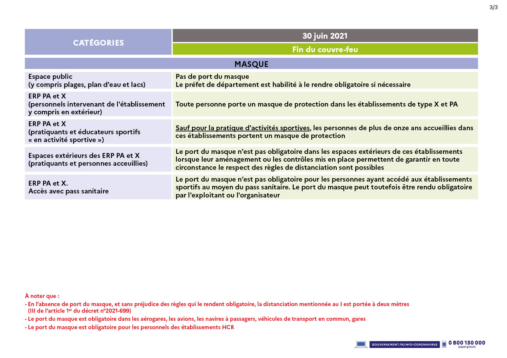 masque (à partir de 11 ans) doit être porté dans les espaces clos (club house- couloirs- vestiaires). Plus d’obligation en extérieur.