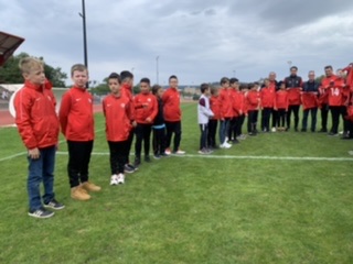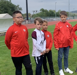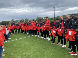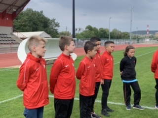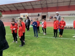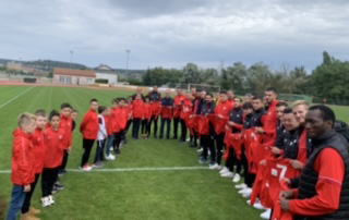 C est aujourd’hui, juste avant de jouer le quatrième tour de Coupe de France, que les joueurs de l équipe fanion, et quelques vétérans, ont remis comme parrain un maillot à un jeune U10 du club.